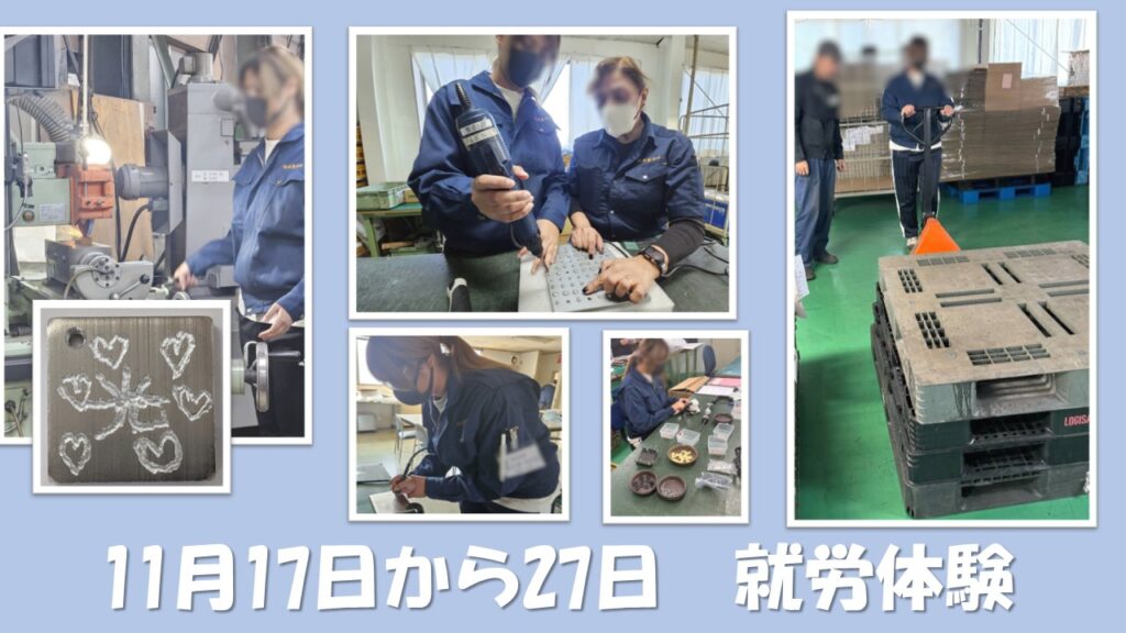 11月10日から14日までの一週間、高校3年生の生徒を受け入れ就労体験を行いました。初めは、緊張した様子でしたが次第に笑顔を見せることが増えていました。1日目は電動ドライバーを使ったあと「難しい」「緊張する」と話していましたが、2日目では「楽しい... -